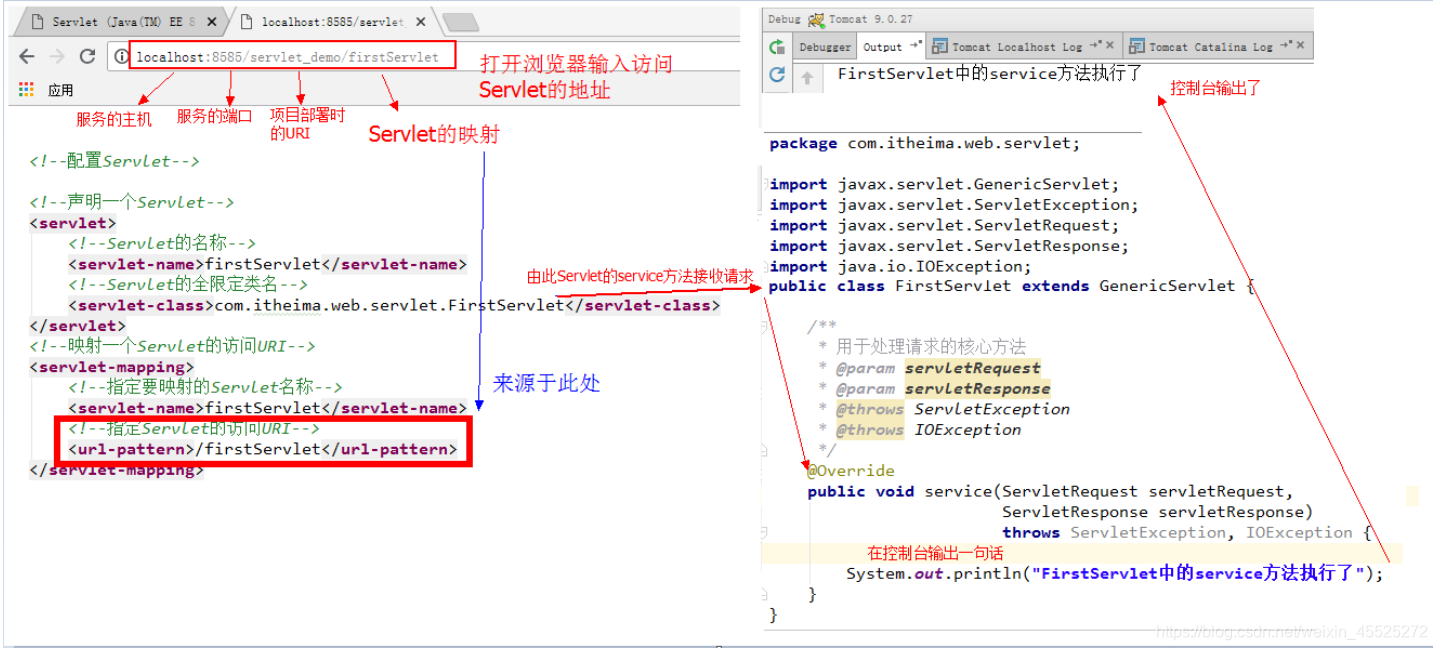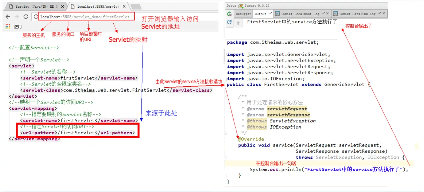 浏览器——>Tomcat服务器——>我们的应用——>应用中的web.xml——>FirstServlet——>响应浏览器