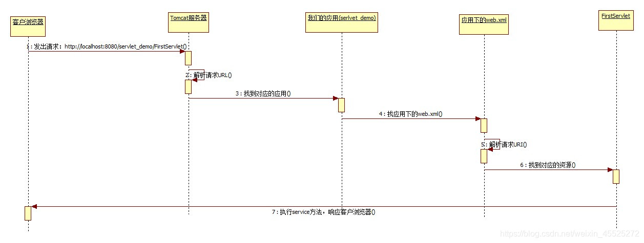 我们通过浏览器发送请求,请求首先到达Tomcat服务器,由服务器解析请求URL,然后在部署的应用列表中找到我们的应用。接下来,在我们的应用中找应用里的web.xml配置文件,在web.xml中找到FirstServlet的配置,找到后执行service方法,最后由FirstServlet响应客户浏览器。整个过程如下图所示: