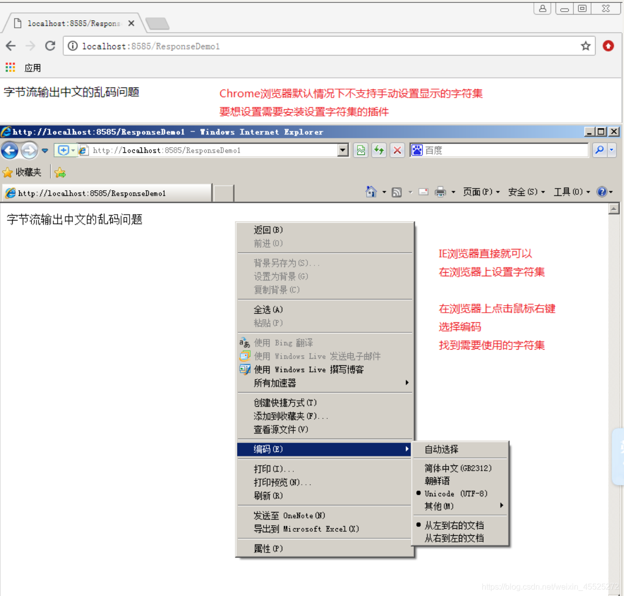修改浏览器的编码,使用右键——编码——改成UTF-8。(不推荐使用,我们的应用尽量不要求用户取做什么事情)