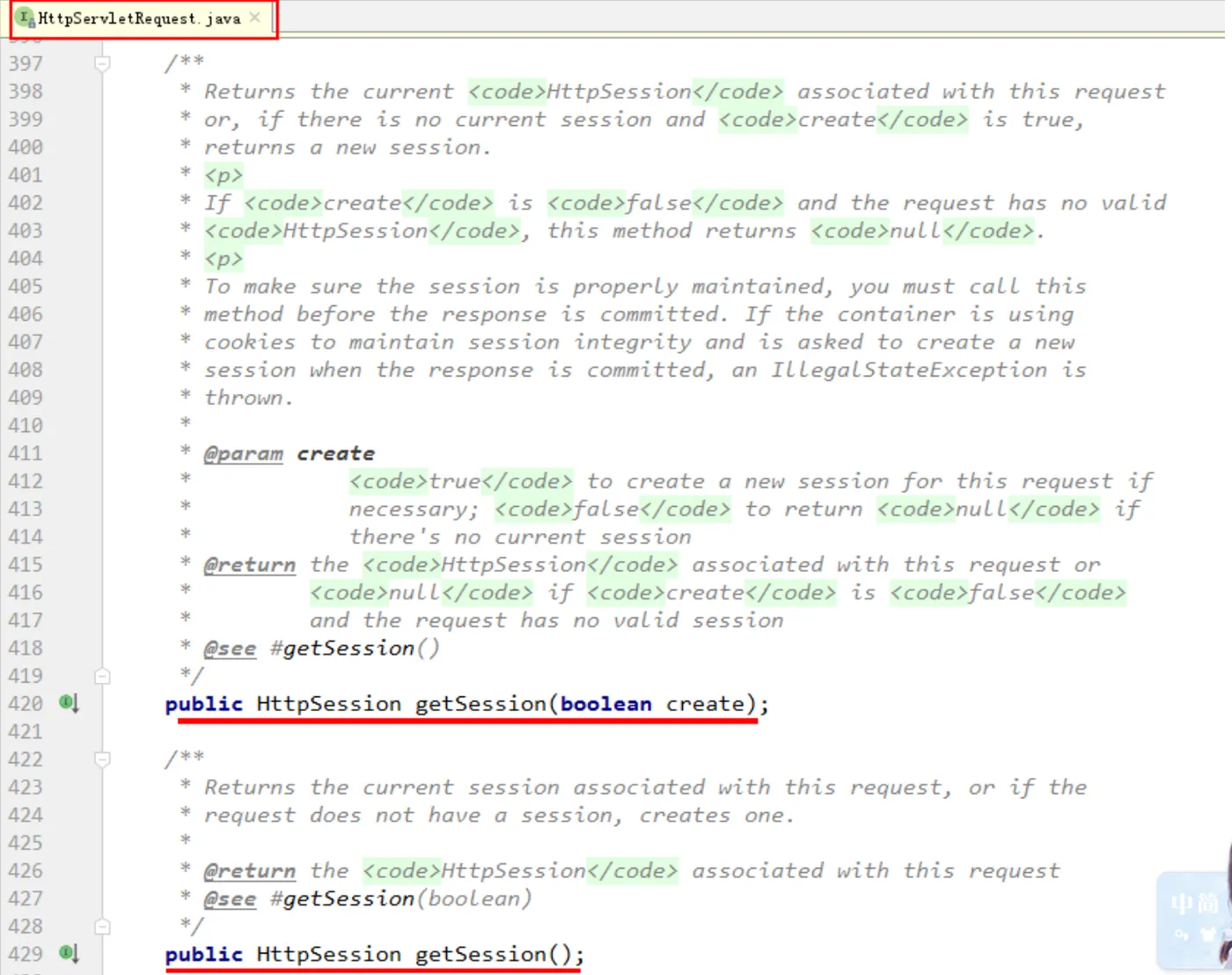 获取HttpSession是通过HttpServletRequest接口中的两个方法获取的,如下图所示: