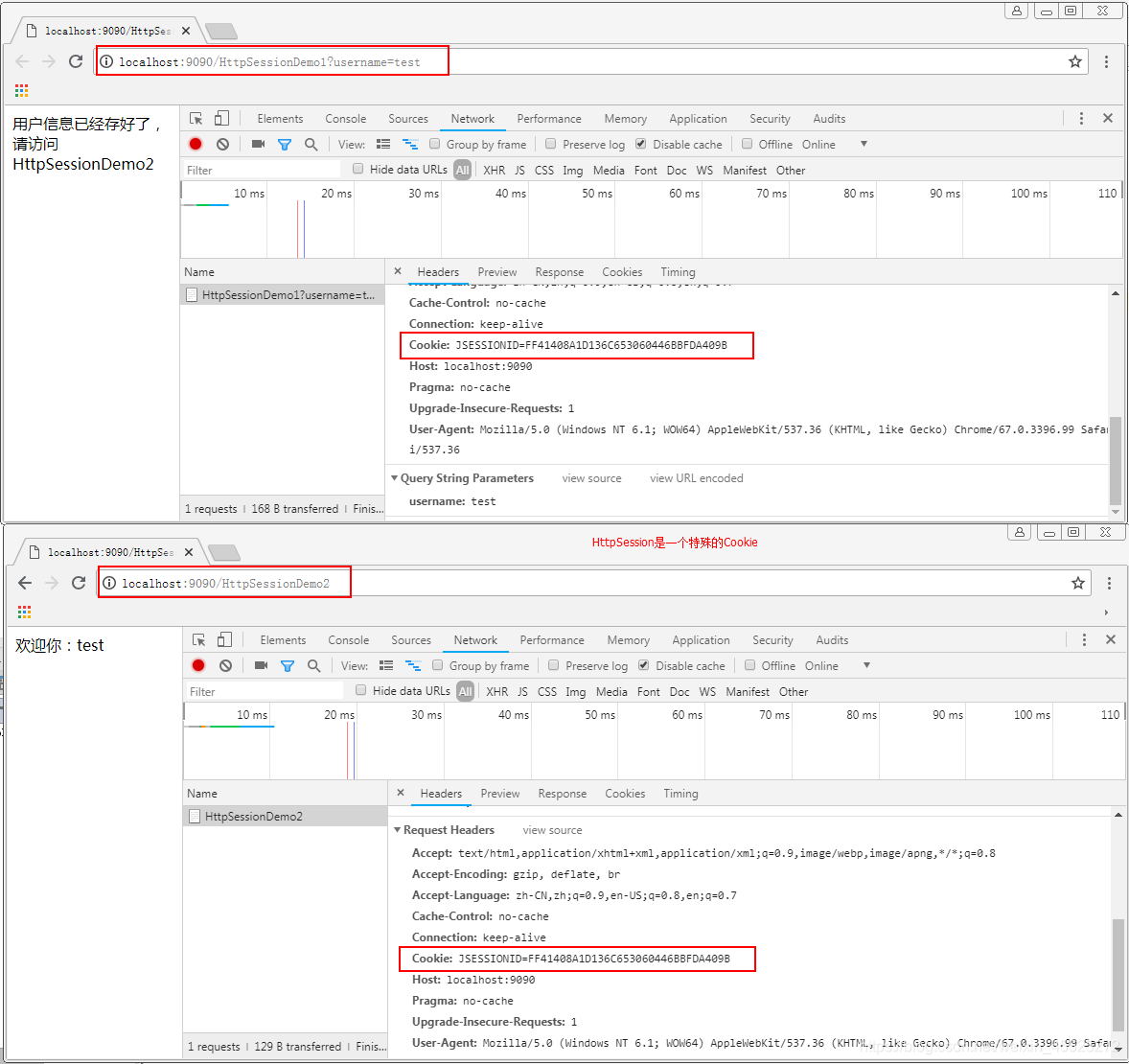 当我们使用HttpSession时,浏览器在没有禁用Cookie的情况下,都会把这个Cookie带到服务器端,然后根据唯一标识去查找对应的HttpSession对象,找到了,我们就可以直接使用了。下图就是我们入门案例中,HttpSession分配的唯一标识,同学们可以看到两次请求的JSESSIONID的值是一样的: