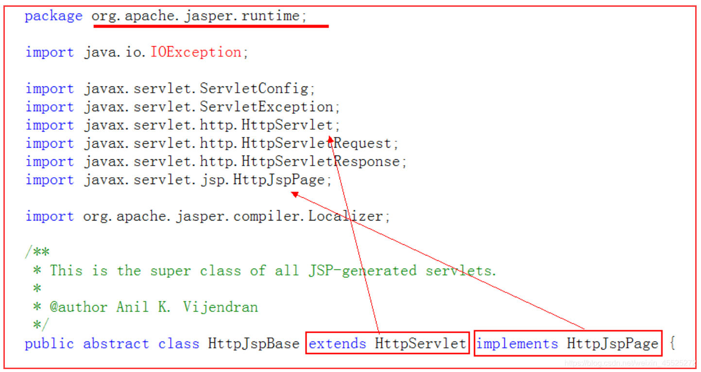 当我们打开index.jsp翻译的java文件看到的就是public final class index_jsp extends org.apache.jasper.runtime.HttpJspBase类的声明,然后我们在Tomcat的源码中找到类的声明,如下图:
