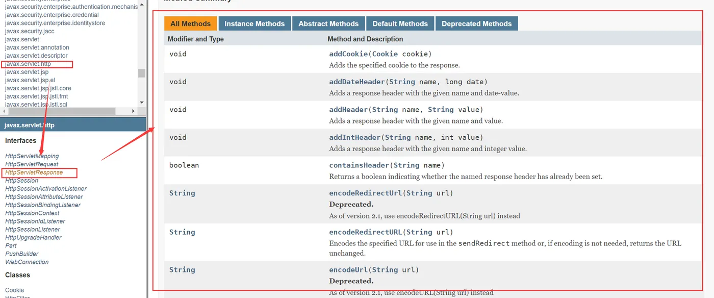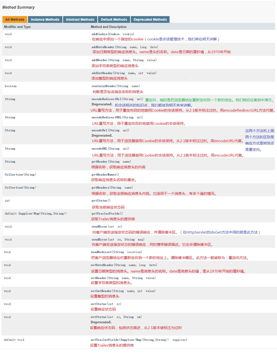 在HttpServletResponse接口中提供了很多方法,接下来我们通过API文档,来了解一下这些方法。