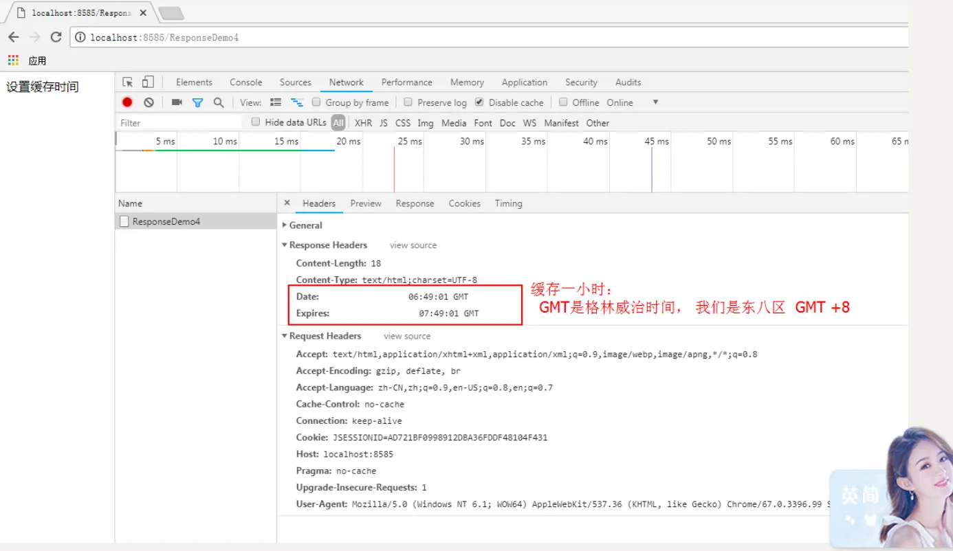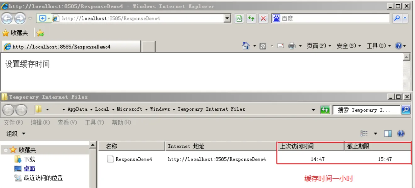 /** * 设置缓存时间 * 使用缓存的一般都是静态资源 * 动态资源一般不能缓存。 * 我们现在目前只掌握了Servlet,所以用Servlet做演示 * */ public class ResponseDemo4 extends HttpServlet { public void doGet(HttpServletRequest request, HttpServletResponse response) throws ServletException, IOException { String str = "设置缓存时间"; /* * 设置缓存时间,其实就是设置响应消息头:Expires 但是值是一个毫秒数。 * 使用的是 * response.setDateHeader(); * * 缓存1小时,是在当前时间的毫秒数上加上1小时之后的毫秒值 */ response.setDateHeader("Expires",System.currentTimeMillis()+1*60*60*1000); response.setContentType("text/html;charset=UTF-8"); response.getOutputStream().write(str.getBytes()); } public void doPost(HttpServletRequest request, HttpServletResponse response) throws ServletException, IOException { doGet(request, response); } }