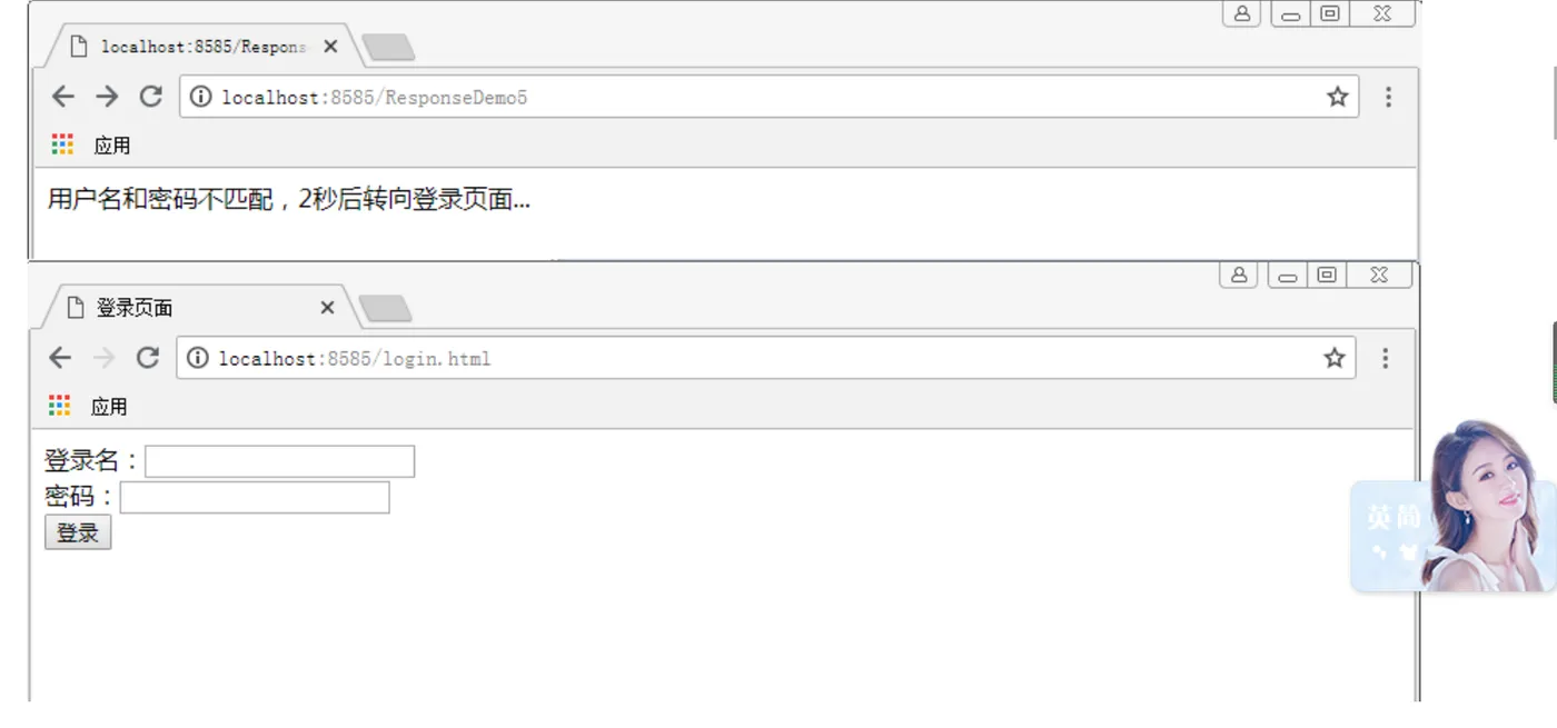 /** * 设置响应消息头: * 通过定时刷新演示添加消息头 */ public class ResponseDemo5 extends HttpServlet { public void doGet(HttpServletRequest request, HttpServletResponse response) throws ServletException, IOException { String str = "用户名和密码不匹配,2秒后转向登录页面..."; response.setContentType("text/html;charset=UTF-8"); PrintWriter out = response.getWriter(); out.write(str); //定时刷新,其实就是设置一个响应消息头 response.setHeader("Refresh", "2;URL=/login.html");//Refresh设置的时间单位是秒,如果刷新到其他地址,需要在时间后面拼接上地址 } public void doPost(HttpServletRequest request, HttpServletResponse response) throws ServletException, IOException { doGet(request, response); } }
