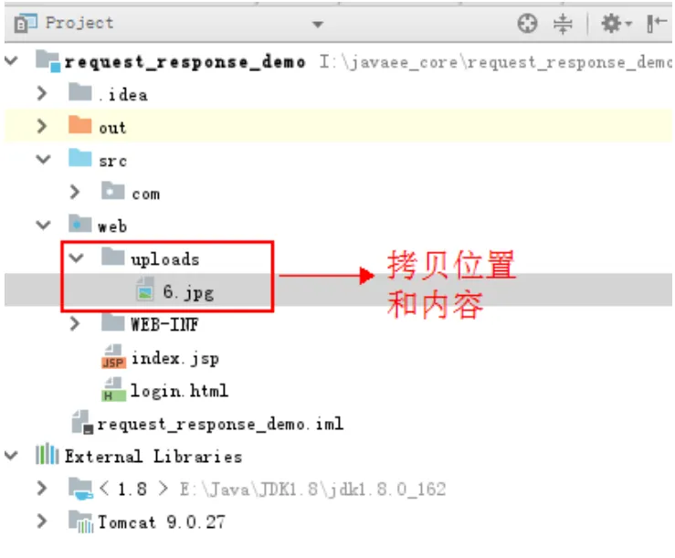 首先,在工程的web目录下新建一个目录uploads,并且拷贝一张图片到目录中,如下图所示: