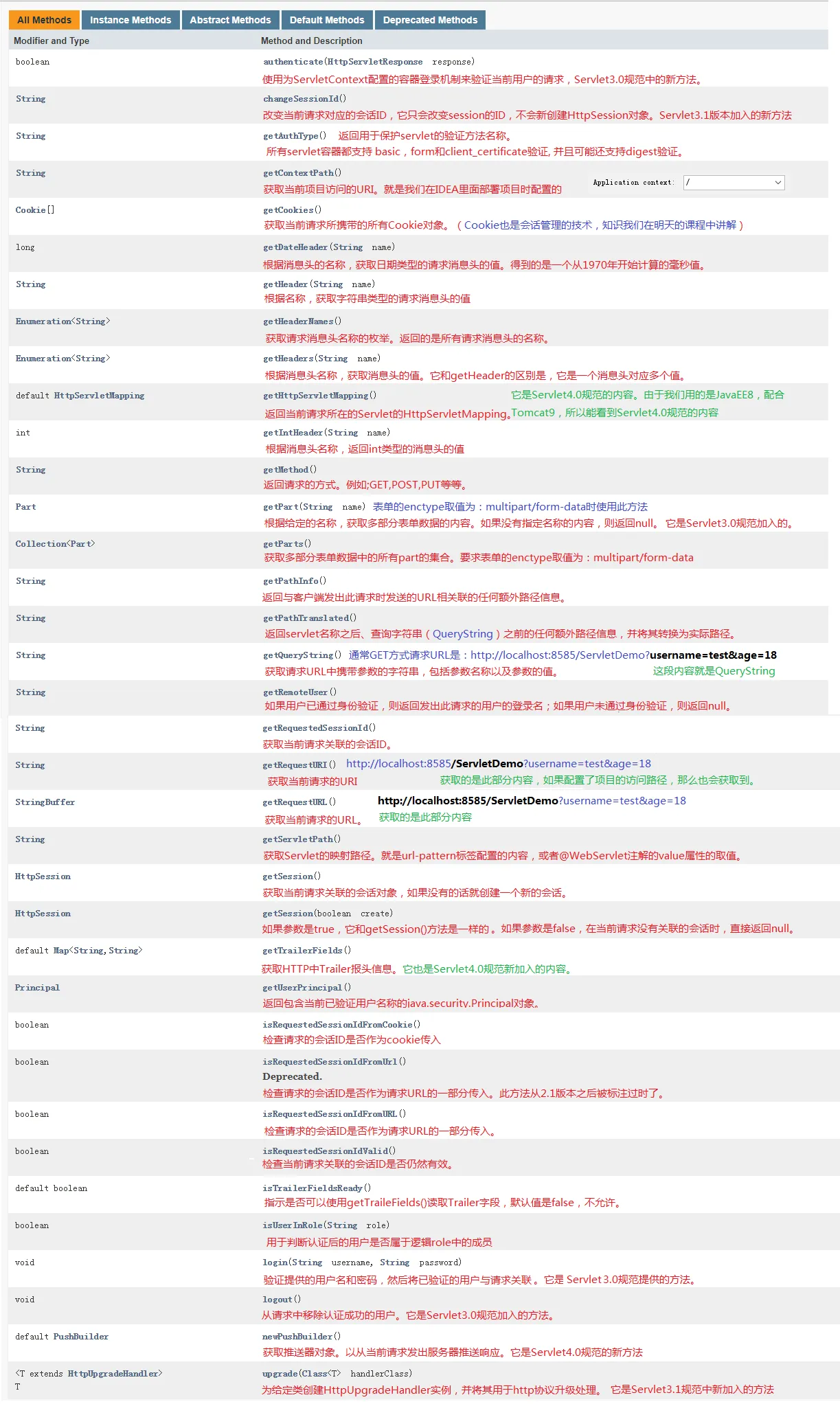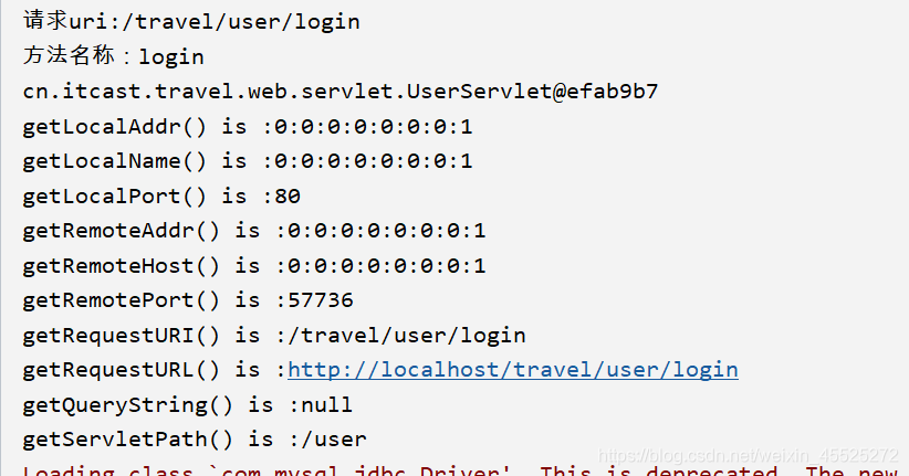 /** * 请求对象的各种信息获取 */ public class RequestDemo1 extends HttpServlet { public void doGet(HttpServletRequest request, HttpServletResponse response) throws ServletException, IOException { //本机地址:服务器地址 String localAddr = request.getLocalAddr(); //本机名称:服务器名称 String localName = request.getLocalName(); //本机端口:服务器端口 int localPort = request.getLocalPort(); //来访者ip String remoteAddr = request.getRemoteAddr(); //来访者主机 String remoteHost = request.getRemoteHost(); //来访者端口 int remotePort = request.getRemotePort(); //统一资源标识符 String URI = request.getRequestURI(); //统一资源定位符 String URL = request.getRequestURL().toString(); //获取查询字符串 String queryString = request.getQueryString(); //获取Servlet映射路径 String servletPath = request.getServletPath(); //输出内容 System.out.println("getLocalAddr() is :"+localAddr); System.out.println("getLocalName() is :"+localName); System.out.println("getLocalPort() is :"+localPort); System.out.println("getRemoteAddr() is :"+remoteAddr); System.out.println("getRemoteHost() is :"+remoteHost); System.out.println("getRemotePort() is :"+remotePort); System.out.println("getRequestURI() is :"+URI); System.out.println("getRequestURL() is :"+URL); System.out.println("getQueryString() is :"+queryString); System.out.println("getServletPath() is :"+servletPath); } public void doPost(HttpServletRequest request, HttpServletResponse response) throws ServletException, IOException { doGet(request, response); } }
