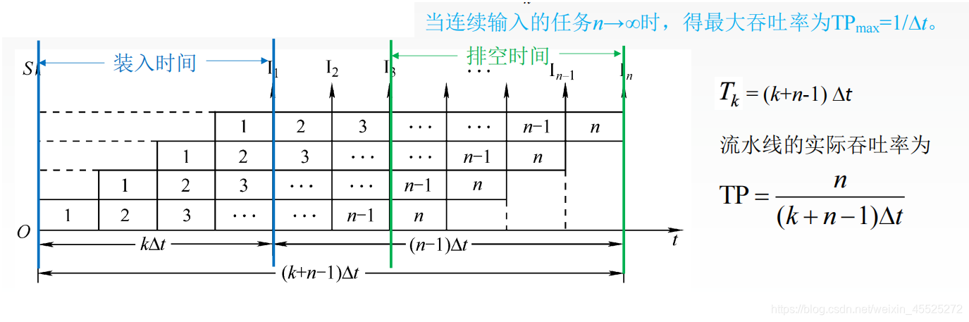 则计算流水线吞吐率(TP)的最基本的公式为 TP = n/Tk。