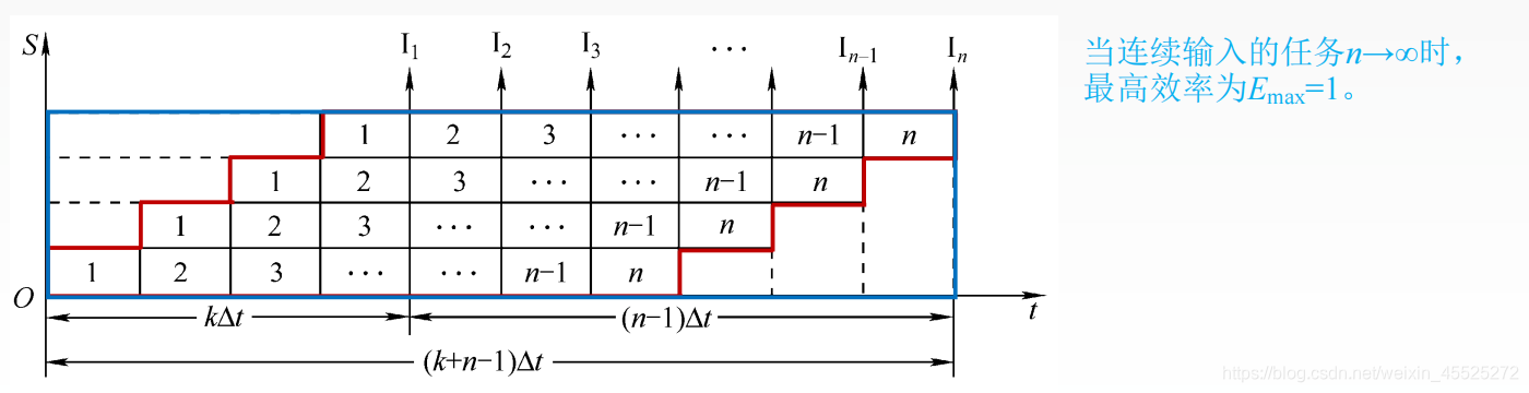 在时空图上,流水线的效率定义为完成n个任务占用的时空区有效面积与 n个任务所用的时间与k个流水段所围成的时空区总面积之比。