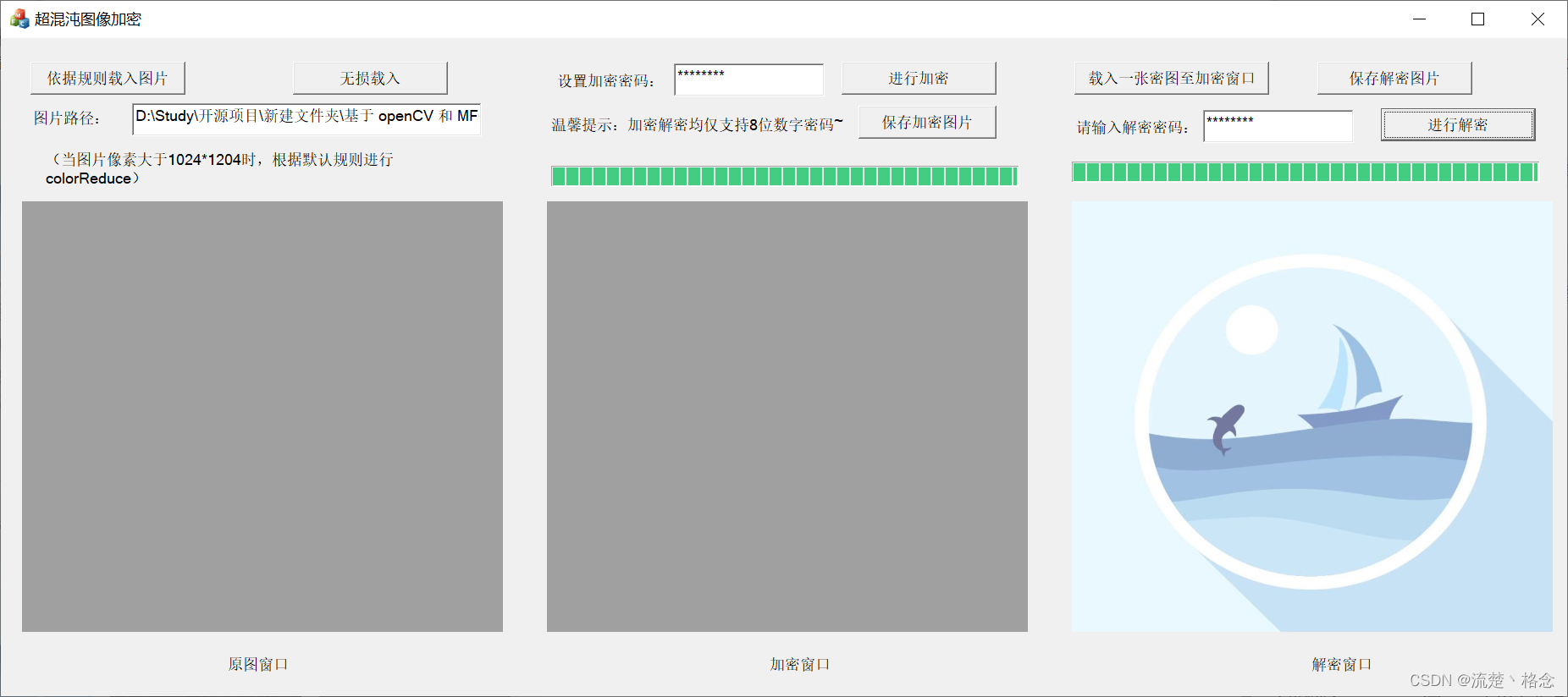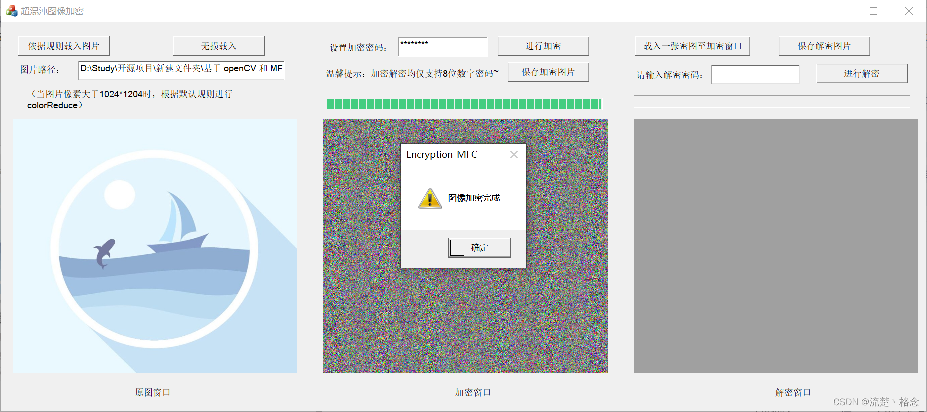 - 基于 openCV 与 MFC 的超混沌图像加密软件,openCV 提供图像读取、存储功能,通过 MFC 构建人机交互界面