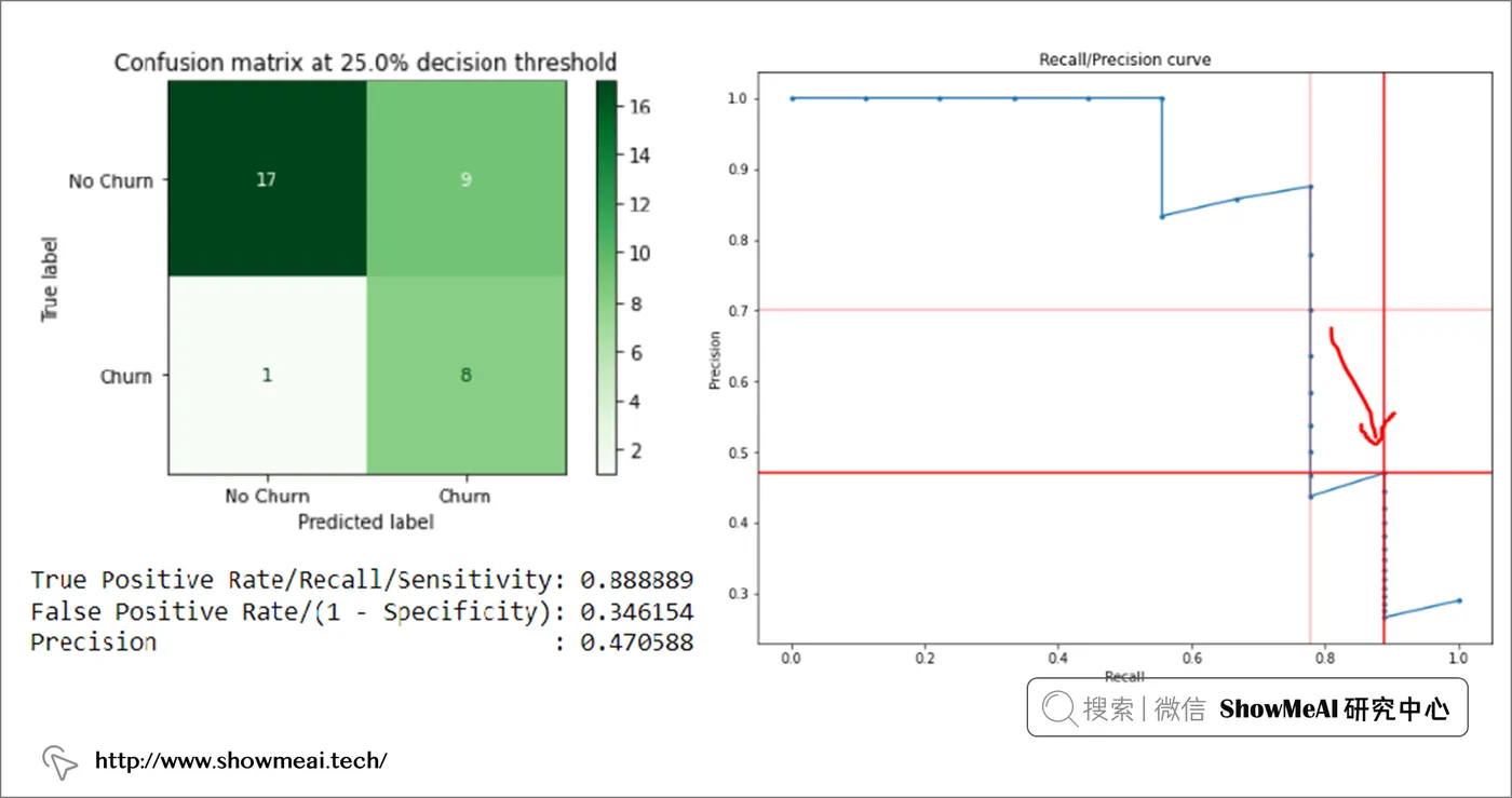 举例来说,在我们当前的例子中,如果我们将决策判定概率从0.5降低到0.25,可以把召回率提升到88.9%,但随之发生变化的是精度降低到47%。