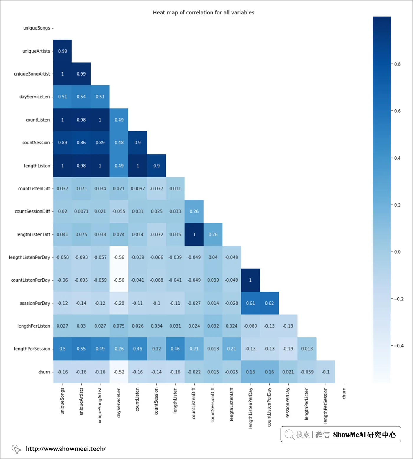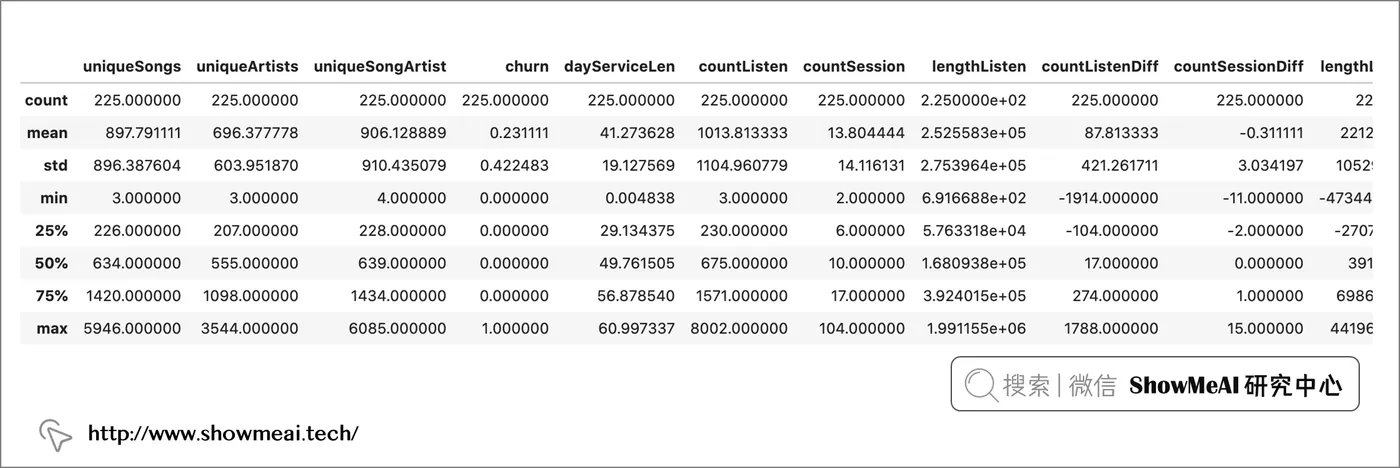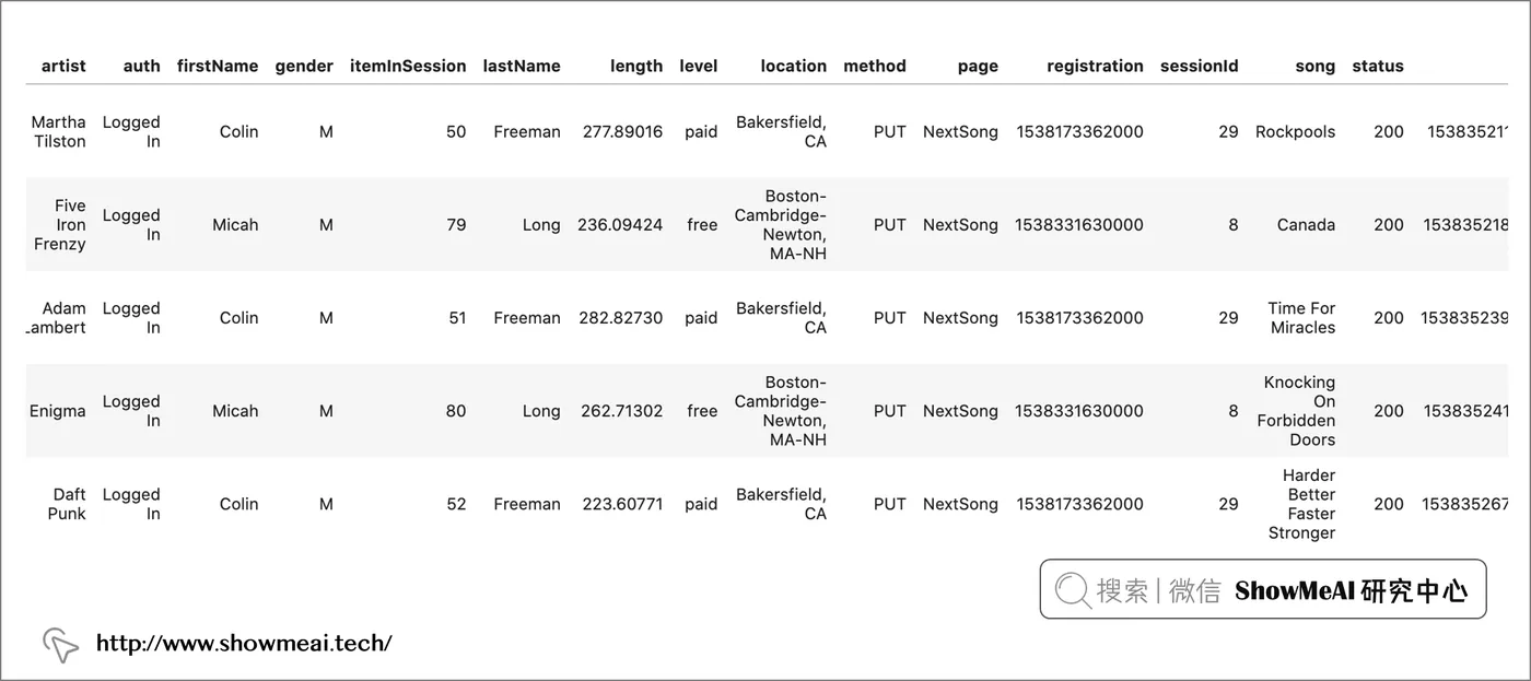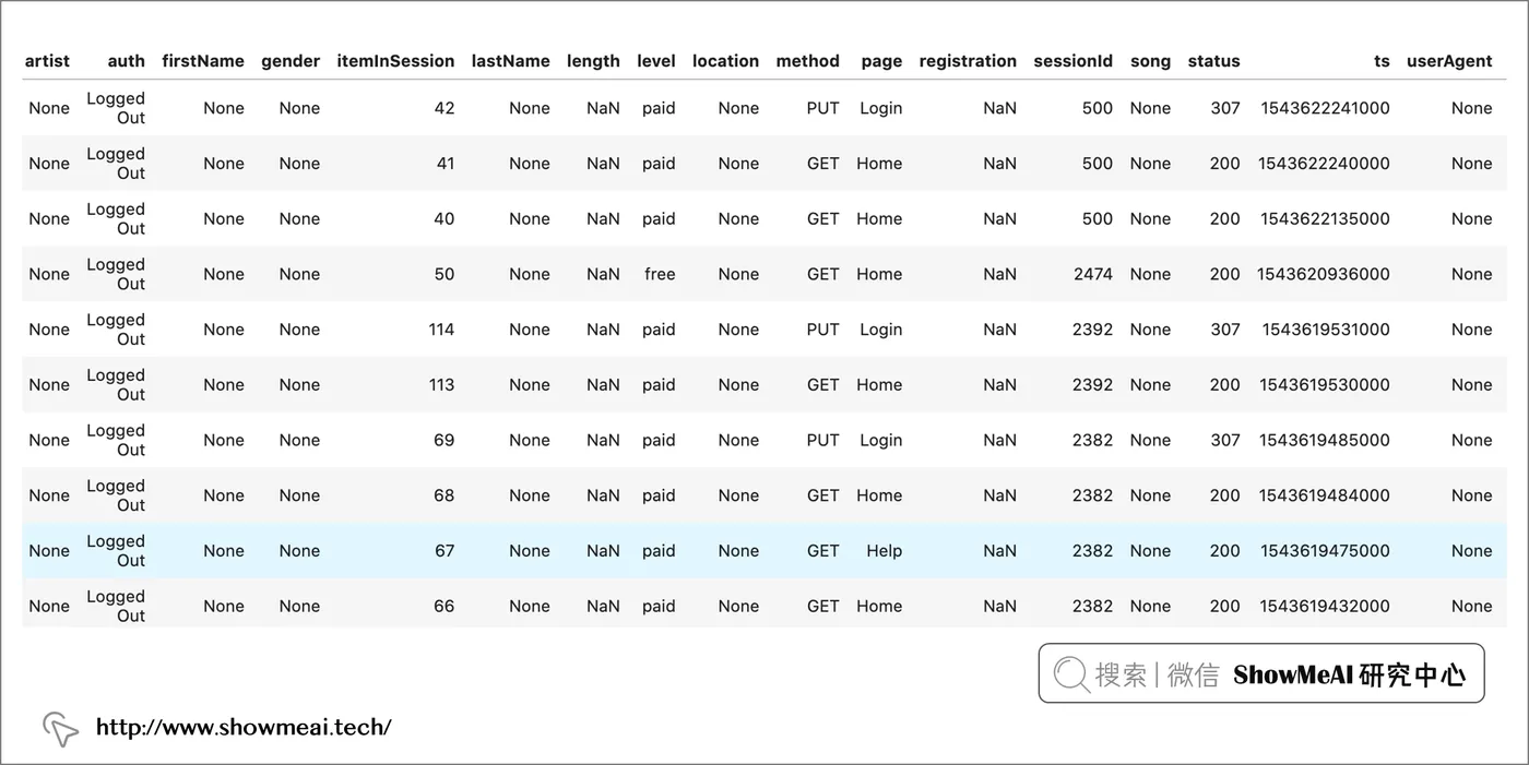🏆 实战数据集下载(百度网盘):公众号『ShowMeAI研究中心』回复『 实战』,或者点击 这里 获取本文 [[9] Spark 海量数据上的用户留存分析挖掘与建模]( https://www.showmeai.tech/article-detail/296) 『 sparkify 用户流失数据集』⭐ ShowMeAI官方GitHub:https://github.com/ShowMeAI-Hub
