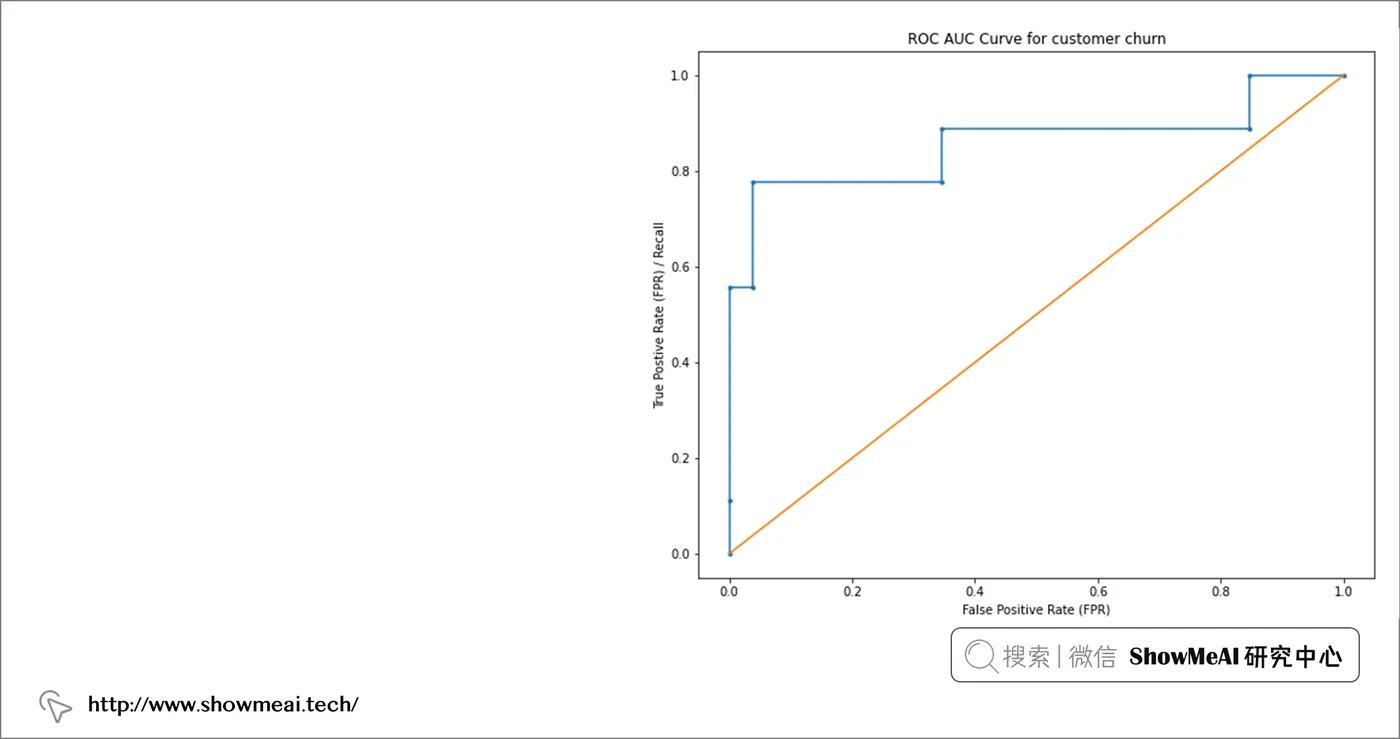 下面的 ROC AUC 曲线清楚地显示了召回率(真阳性率)和假阳性率之间的权衡。