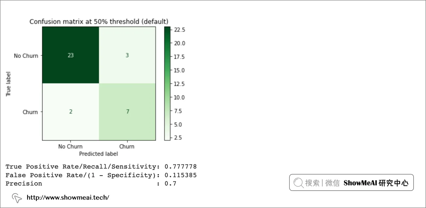 查看下面的混淆矩阵,用0.5的默认概率阈值能够正确预测 77.78% 的流失客户 (7/(7+2))
