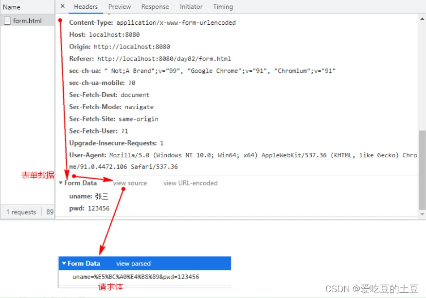 <h1>post-URL编码-正规表单数据提交方式</h1> <!-- application/x-www-form-urlencoded 表单url编码数据 特点:1、提交的数据都是 k=v&k2=v2 2、中文及特殊符号会进行URL编码,保证数据传递中不会因为乱码而丢失。 %16进制位 --> <form method="post" enctype="application/x-www-form-urlencoded"> 用户名:<input type="text" name="uname" value="张三"/> 密码:<input type="password" name="pwd" value="123456"/> 附件框:<input type="file" name="fj"/> <input type="submit"/> </form> <h1>post-多部件-用于文件上传</h1> <!--适用于文件上传,唯一一种可以将文件二进制数据传递给服务器的表单提交方式 --> <form method="post" enctype="multipart/form-data"> 用户名:<input type="text" name="uname" value="张三"/> 密码:<input type="password" name="pwd" value="123456"/> 附件框:<input type="file" name="fj"/> <input type="submit"/> </form> <h1>post-纯文本-一般用于不用URL编码,不进行文件上传</h1> <!--提交的是原本的数据,可能存在中文乱码丢失问题。传递的数据字节长度是最短的 --> <form method="post" enctype="text/plain"> 用户名:<input type="text" name="uname" value="张三"/> 密码:<input type="password" name="pwd" value="123456"/> 附件框:<input type="file" name="fj"/> <input type="submit"/> </form>