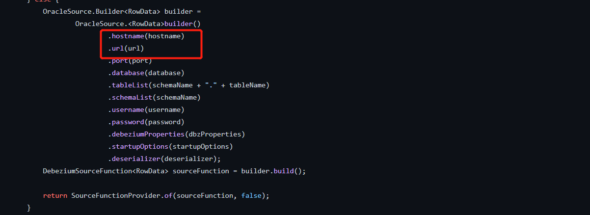 https://github.com/ververica/flink-cdc-connectors/blob/master/flink-connector-oracle-cdc/src/main/java/com/ververica/cdc/connectors/oracle/table/OracleTableSource.java url, hostname都可以设置