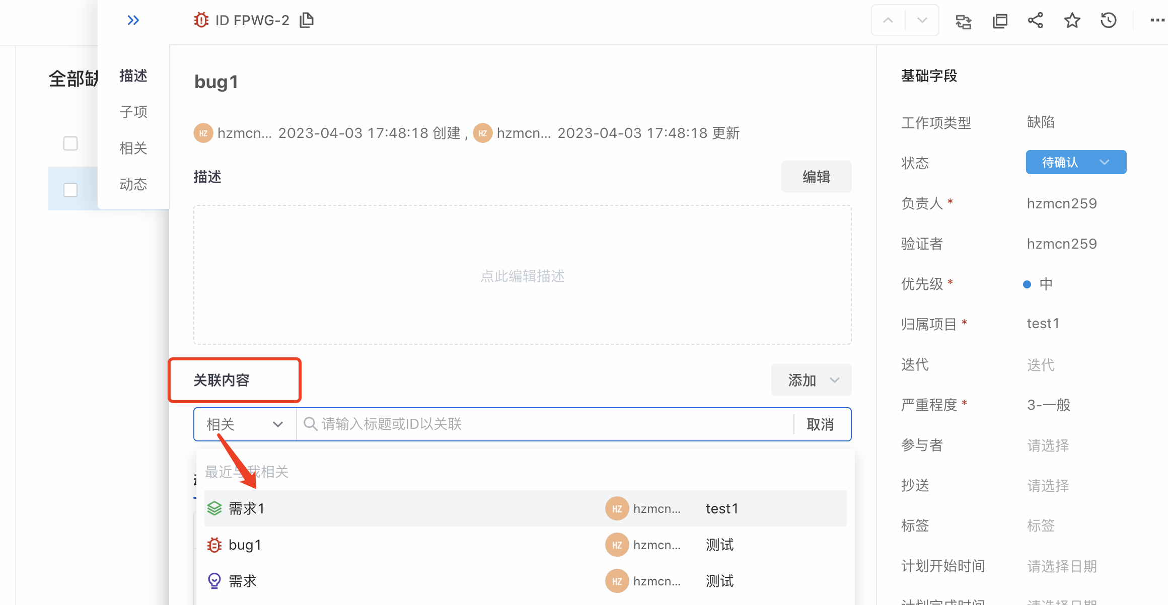 在新建bug-关联内容-选择关联需求。