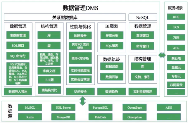 数据管理DMS:是一种数据管理,结构管理,用户授权,安全审计,数据趋势,数据追踪,bi图表,性能与优化和服务器管理于一体的数据管理服务。