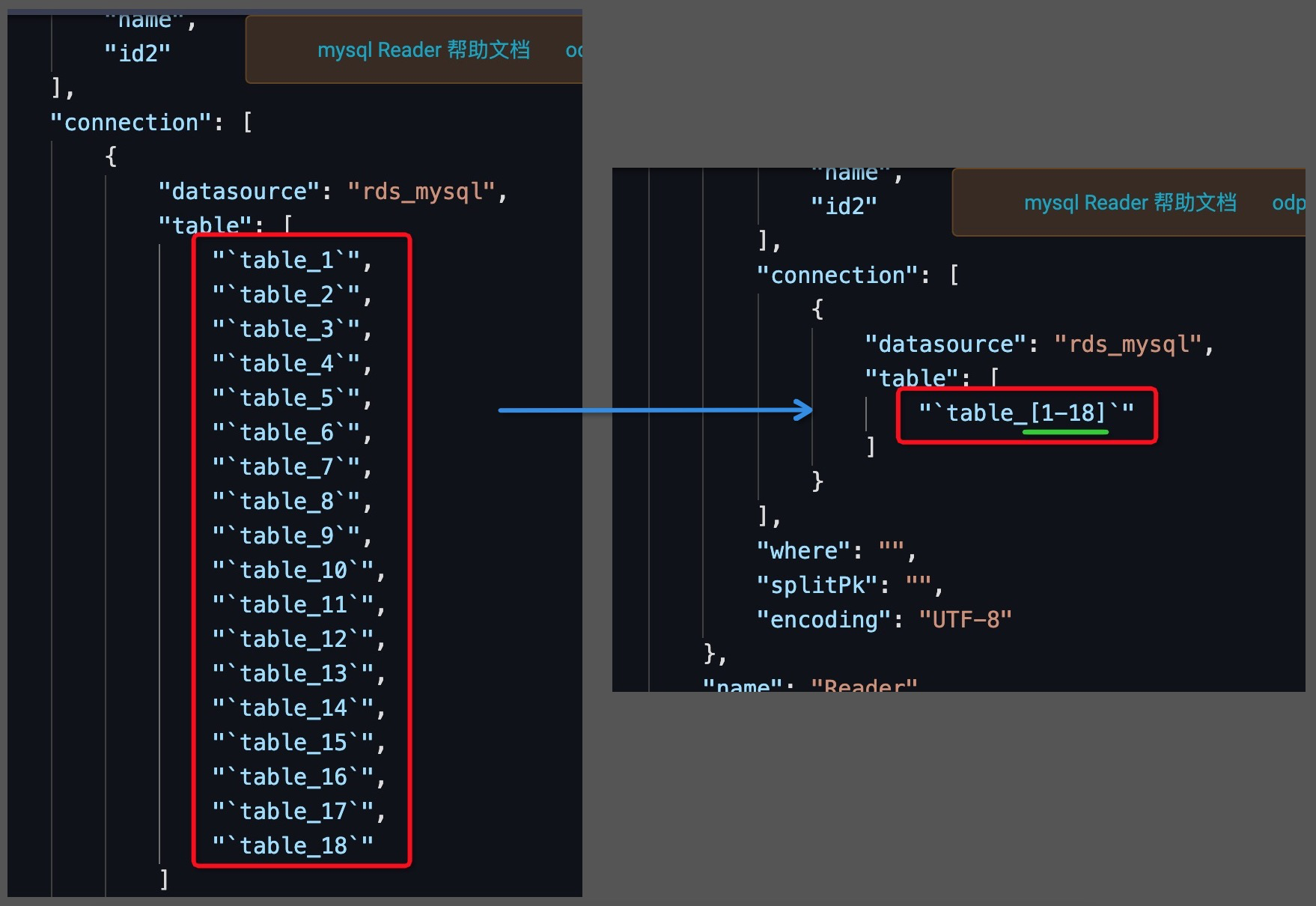 如果每个库下还有多个表命名有规律,此时依旧可以切换到脚本模式,然后使用特殊表名命名规则来支持。 注意: 1、目前只支持mysql数据源; 2、源端的表结构要相同,不同的数据库密码要相同; 3、多个库要添加多个数据源; 可以用同步解决方案里整库离线同步;,此回答整理自钉群“DataWorks交流群(答疑@机器人)”