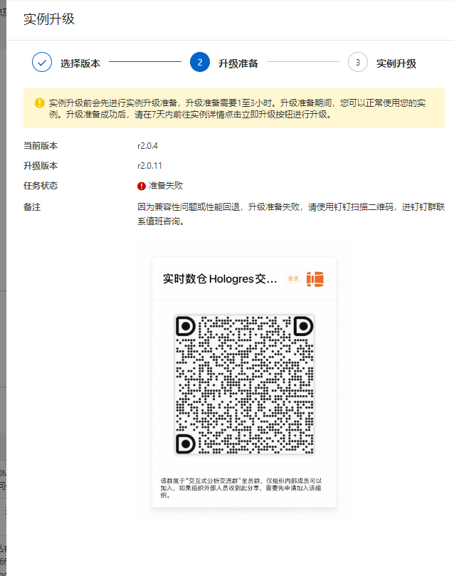 如果您无法找到升级日志,或者升级日志中没有显示原因,您可以联系 Hologres 的技术支持寻求帮助。