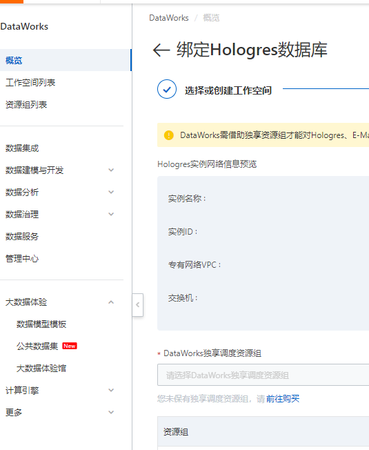 需要注意的是,由于独享资源组具有独立的计算资源,因此可能会产生额外的费用。请您在绑定Holo引擎时,仔细评估和规划资源使用和费用预算。