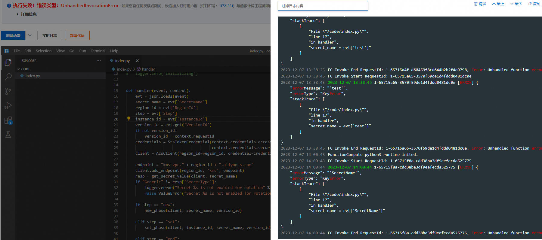 Request ID 或关键字,快速查找相关日志并分析问题原因。os._exit(-1) 或类似方式强制退出进程的情况。这种方式会导致函数计算无法捕获堆栈信息,从而难以定位问题。