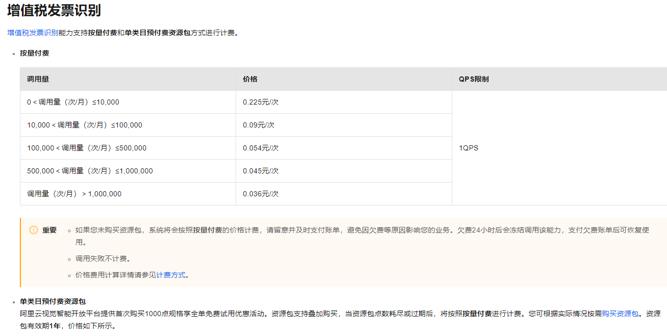 阿里云视觉智能平台的发票识别服务的QPS限制与具体的使用情况和付费方式有关。一般情况下,如果您仅是开通了该服务的能力,默认的QPS限制是不会超过2的。然而,如果在使用的过程中出现QPS只有1的情况,可能是由于某些原因导致的限制。为了获取准确的QPS信息和使用详情,建议您登录阿里云视觉智能开放平台控制台进行查看。此外,该平台提供了多种收费模式,包括按量付费、预付费资源包等,您可以根据自己的需求选择合适的付费方式。