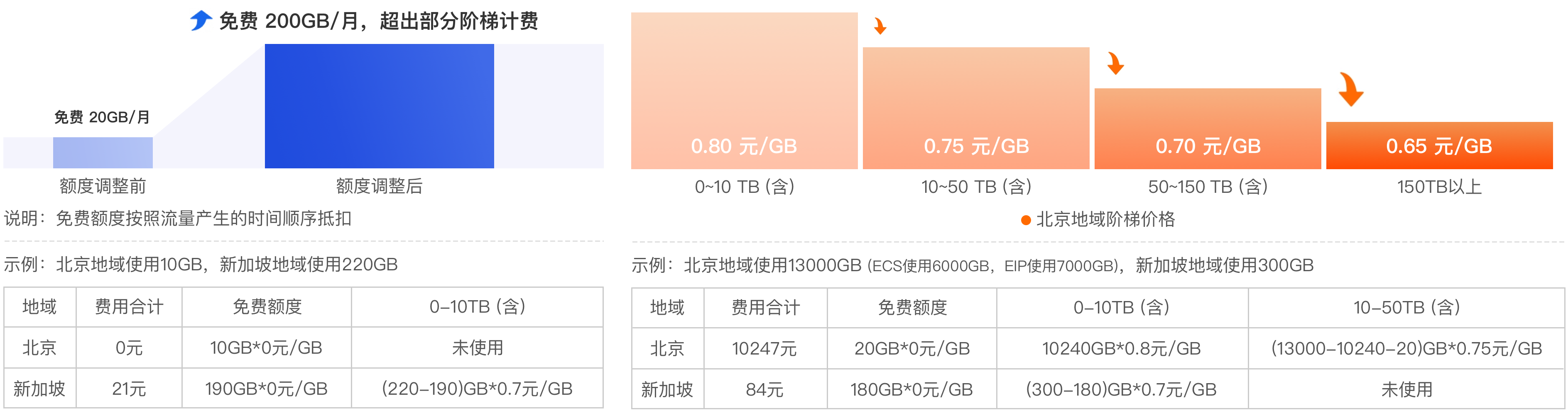 升级CDT计费后,赠送200GB/月公网流量 (其中20GB/月可用于中国内地地域);并且流量按阶梯计费。