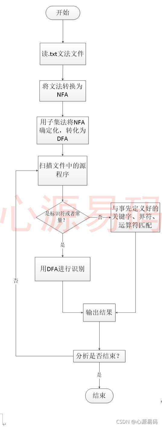 从左至右地对源程序进行扫描,按照语言的词法规则识别各类单词,并产生相应单词的属性字。