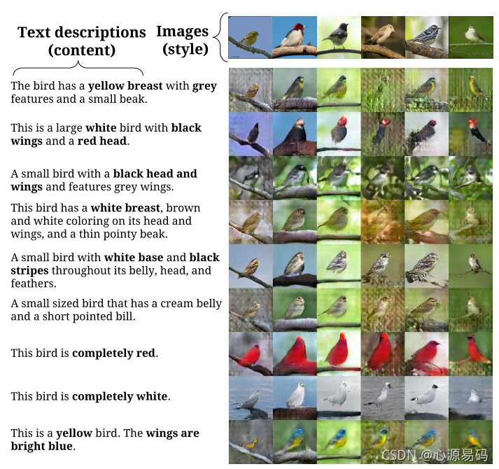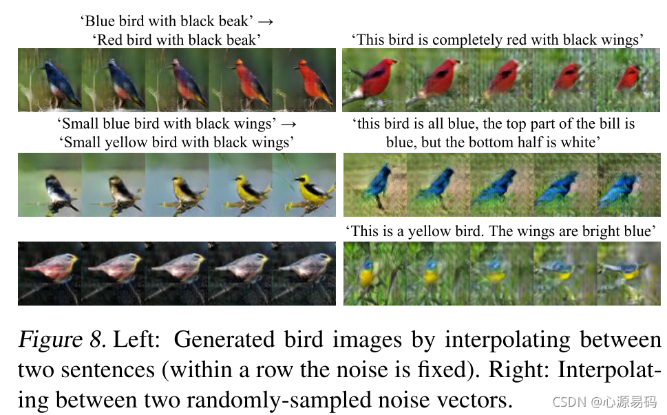 通过插值学习的文本流形,通过控制插值可以准确反映颜色信息,例如鸟类从蓝色变为红色,而姿势和背景不变。通过控制两个噪声向量之间进行插值,并保持内容固定,生成两种样式之间平滑过渡的鸟类图像。如下图,左图是保证随机噪声不变,改变两个句子的权重大小(即内容变、风格不变)。右图是保证句子不变,对两个随机噪声做插值(即内容不变风格变)。
