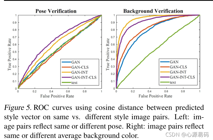 文章把图像根据图的背景色,鸟或者花的姿态利用k-means聚成了100个类。用训练的CNN网络用G生成的图片预测style,并计算style和其同类与不同类图像的cos相似度。从下图中可看出,文本caption表现出一条直线,说明文本和图像的style是完全没有关系的(ROC曲线越是靠近左上角,灵敏度越高,误判率越低,则诊断方法的性能越好)