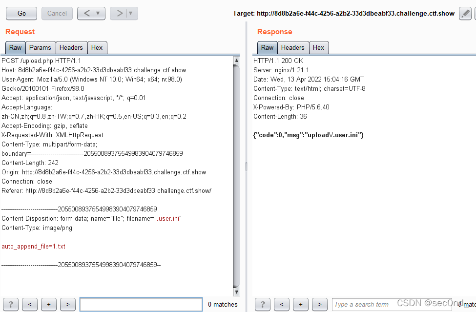 可以利用user.ini包含日志文件或者包含图片马(参考其他博客) 同样的提示说后端检验要严密,访问url/upload,发现可以访问,也即该目录下存在一个php文件,可以利用.user.ini文件上传,该文件只有在有php文件的时候才生效