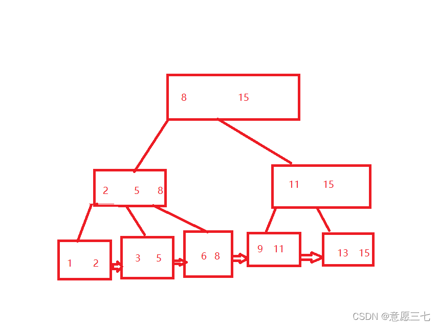 B+树做出的改变:这里大家看见看见重复了最后也是一个8,大家别急着说浪费空间,可能也是一个改进