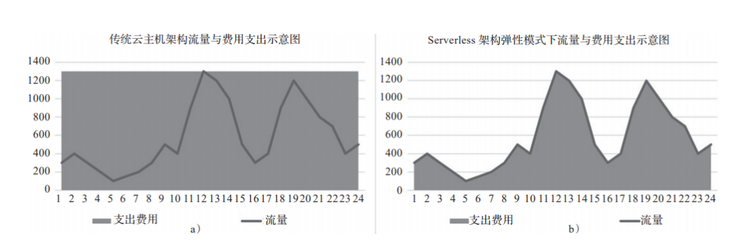 1-5 传统云主机架构与 Serverless 架构弹性模式下流量与费用支出对比示意图