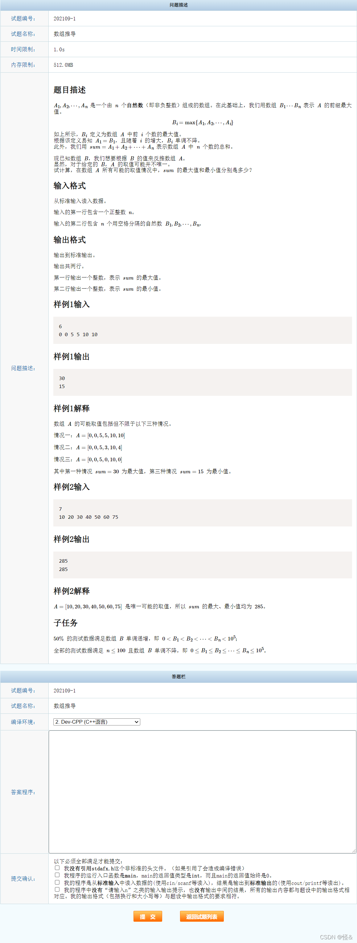 #include <iostream> using namespace std; #define N 101 int n=0;//n个数 int b[N];//存储Bn的值 int MaxSum=0;//存储最大和 int MinSum=0;//存储最小和 void InputBn(){ for(int i=0;i<n;i++){ cin>>b[i]; if(i==0){//初始化MaxSum,MinSum MaxSum=MaxSum+b[i]; MinSum=MinSum+b[i]; } else if(b[i]==b[i-1]){//b[i]==b[i-1]时,MaxSum再加一次此值,MinSum+0 MaxSum=MaxSum+b[i]; MinSum=MinSum+0;//方便理解 } else{//否则,MaxSum+b[i],MinSum+b[i] MaxSum=MaxSum+b[i]; MinSum=MinSum+b[i]; } } } void OutputBn(){ for(int i=0;i<n;i++){ cout<<b[i]<<" "; } } void Output(){ cout<<MaxSum<<endl; cout<<MinSum<<endl; } int main(){ cin>>n;//输入n InputBn();//输入各个Bn值,同时为MaxSum,MinSum赋值 Output(); return 0; }