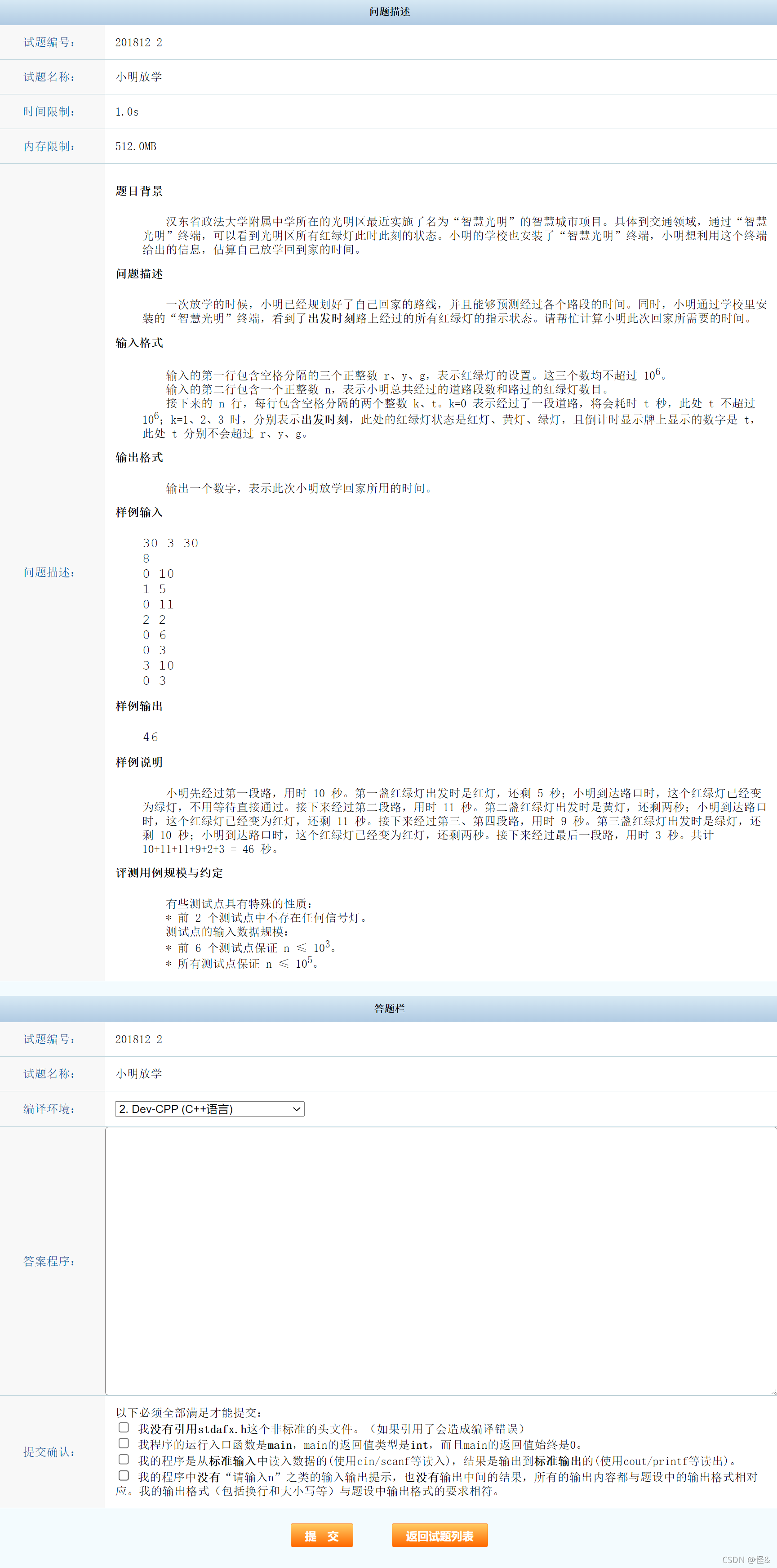 #include <iostream> using namespace std; int main() { //灯顺序为 红、绿、黄 循环 int red,yellow,green;//红、黄、绿灯的额定时间 int n;//经过道路/红绿灯总数 long long SumTime=0;//小学上学所用时间 cin>>red>>yellow>>green; cin>>n; for(int i=0;i<n;i++){ int k,t; cin>>k>>t; if(k==0){ SumTime=SumTime+t; } else if(k==1){//初始为红灯 int time=SumTime%(red+yellow+green); if(time<=t){SumTime=SumTime+t-time;}//此轮回没有走出红灯 else if(t+green<=time && time<t+green+yellow){SumTime=SumTime+(t+green+yellow-time)+red;}//到达时已变为绿灯变为黄灯 else if(t+green+yellow<=time && time<t+green+yellow+red){SumTime=SumTime+(t+green+yellow+red-time);}//此轮回出红灯后再次进入红灯 } else if(k==2){//初始为黄灯 int time=SumTime%(red+yellow+green); if(time<t){//没有走出黄灯 SumTime=SumTime+t-time+red; } else if(t<=time &&time<t+red ){//到达时为红灯 SumTime=SumTime+(t+red-time); } else if(t+red+green<=time && time<t+red+green+yellow){SumTime=SumTime+(t+green+yellow+red-time)+red;}//此轮回中出了黄灯再次进入黄灯 } else if(k==3){//初始为绿灯 int time=SumTime%(red+yellow+green); if(t<time &&time<t+yellow){//到达时为黄灯 SumTime=SumTime+(t+yellow-time)+red; } else if(t+yellow<time && time<t+yellow+red){//到达时为红灯 SumTime=SumTime+(t+yellow+red-time); } //此轮回第1、2次进入绿灯对SumTime没有影响 } } cout<<SumTime<<endl; return 0; }