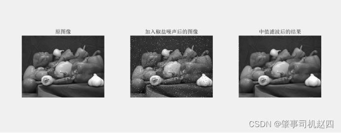 %自编程实现中值滤波 clear; n=5; %模板大小 image = imread('peppers.png'); I=rgb2gray(image); J=imnoise(I,'salt',0.02); [height, width] = size(J); %获取图像尺寸 FilterMid = J; for row = (n+1)/2:height-(n-1)/2 for col = (n+1)/2:width-(n-1)/2 temp = double(J(row-((n-1)/2):row+((n-1)/2),... col-((n-1)/2):col+((n-1)/2))); %获取模板区域 %中值滤波 template2 = sort(temp(:)); %对模板区域内像素值进行排序 FilterMid(row, col) = template2((n*n+1)/2); %更新模板中心像素值 end end figure ,subplot(1,3,1),imshow(I),title('原图像'); subplot(1,3,2),imshow(J),title('加入椒盐噪声后的图像'); subplot(1,3,3),imshow(FilterMid),title('中值滤波后的结果');