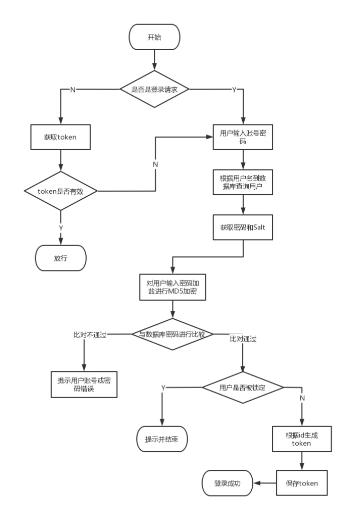 而用户登录时候首先会根据用户账号到数据库中查询该用户信息,然后将用户输入的密码与数据库中获得的Salt进行合并加密并与数据库中的密码(已加盐加密)进行比对,如果比对失败则提示相关信息,比对成功则判断用户状态,只有未被锁定方可继续操作。用户账号状态正常的话才能根据用户id生成token并保存然后放行。