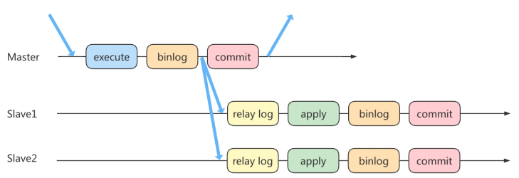 步骤3:`Slave`重做中继日志中的事件,将改变应用到自己的数据库中。 MySQL复制是异步的且串行化的,而且重启后从`接入点`开始复制。