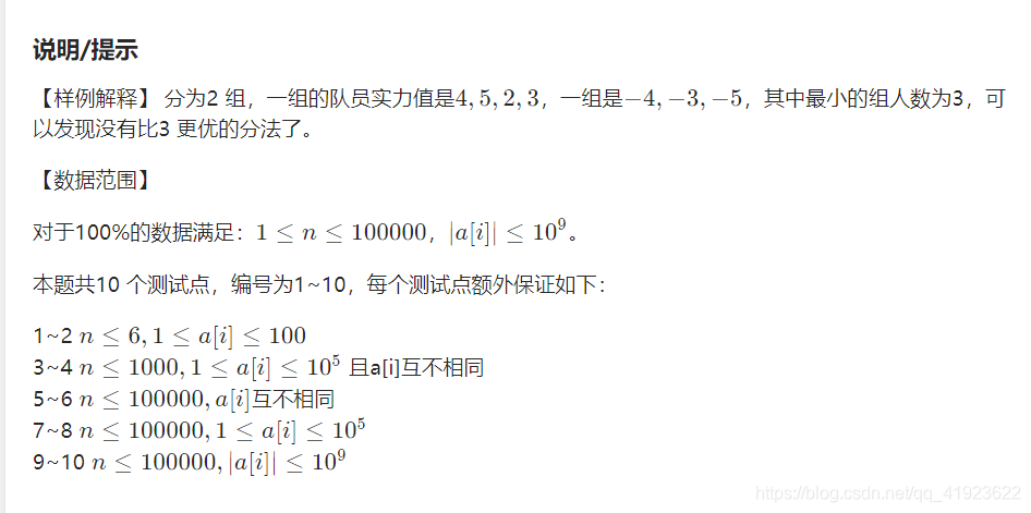 例如: 1 2 2 3 3 4 4 5 满足条件 分成 [ 1 2 3 4 5] 和 [2 3 4] 就够了,不要为了人数少二多开一个 变成 [1 2 3] ,[4 5] 和 [ 2 3 4]; 这么搞 还不如一个人一组; 出题人的意思就 这些数的 分法 其实都固定死的,只不过让你用手段找找这些分组中 ,人数最小的组的大小。