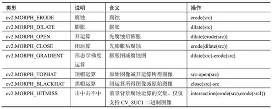 - op代表操作类型,各种形态学运算的操作规则均是将腐蚀和膨胀操作进行组合而得到的。