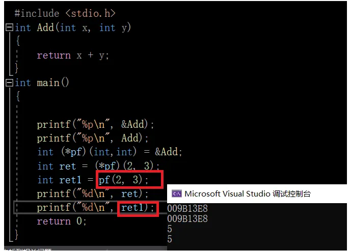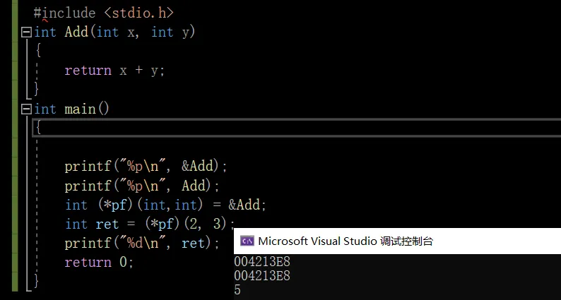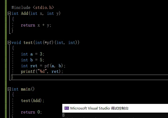 #include <stdio.h> int Add(int x, int y) { return x + y; } void test(int(*pf)(int, int)) { int a = 3; int b = 5; int ret = pf(a, b); printf("%d", ret); } int main() { test(Add); return 0; }