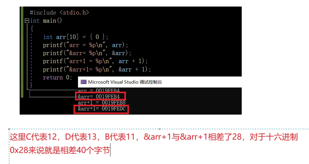 数组的地址+1,跳过整个数组的大小,所以 &arr+1 相对于 &arr 的差值是40。这时候,你可能会问了,这个40是怎么根据上面算出来的?