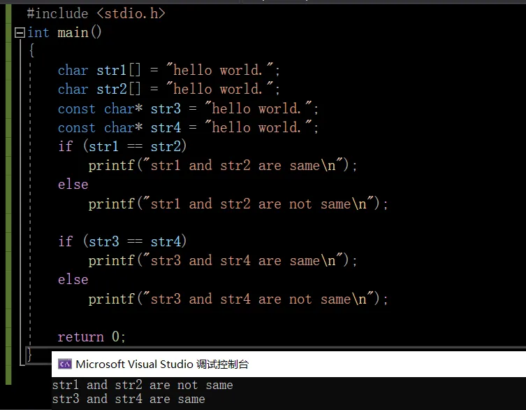 #include <stdio.h> int main() { char str1[] = "hello world."; char str2[] = "hello world."; const char* str3 = "hello world."; const char* str4 = "hello world."; if (str1 == str2) printf("str1 and str2 are same\n"); else printf("str1 and str2 are not same\n"); if (str3 == str4) printf("str3 and str4 are same\n"); else printf("str3 and str4 are not same\n"); return 0; }