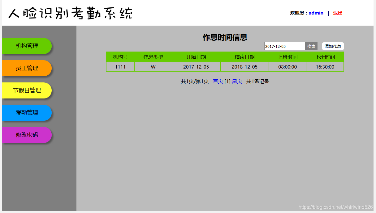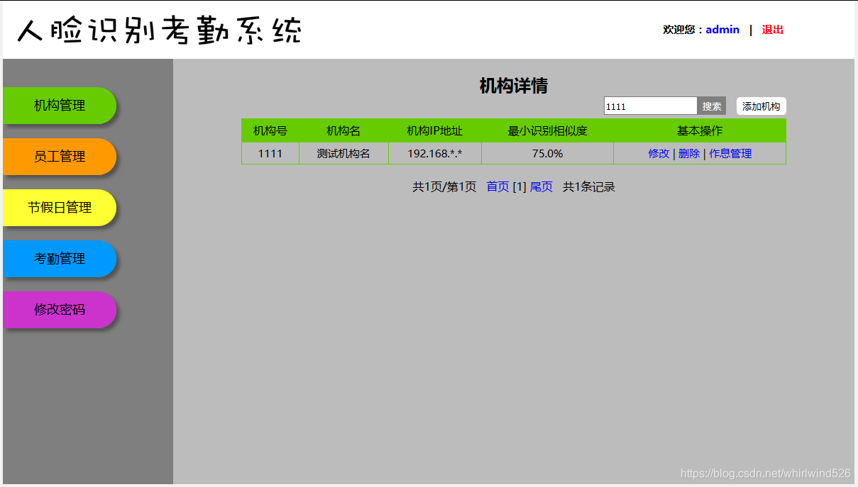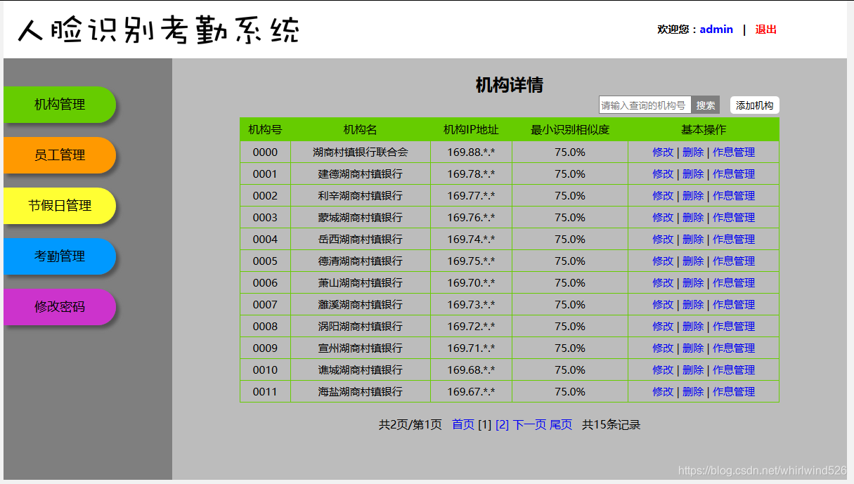 4. 点击【机构管理】,进入机构详情页面。该页面可添加机构、搜索机构、修改机构、删除机构和设置机构的作息管理。