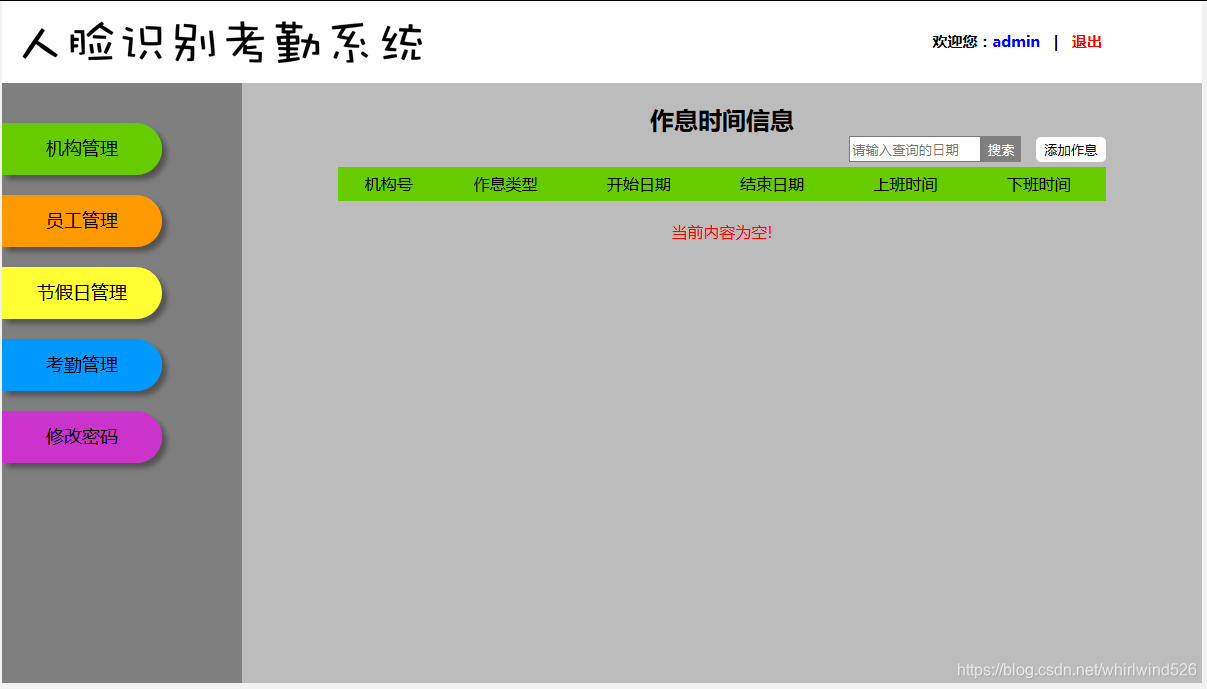 9. 点击【作息管理】,进入作息时间页面。该页面可添加作息和搜索日期。如下图: