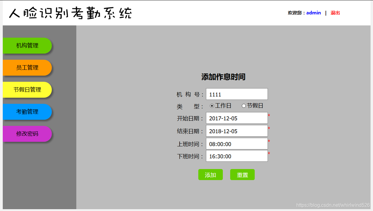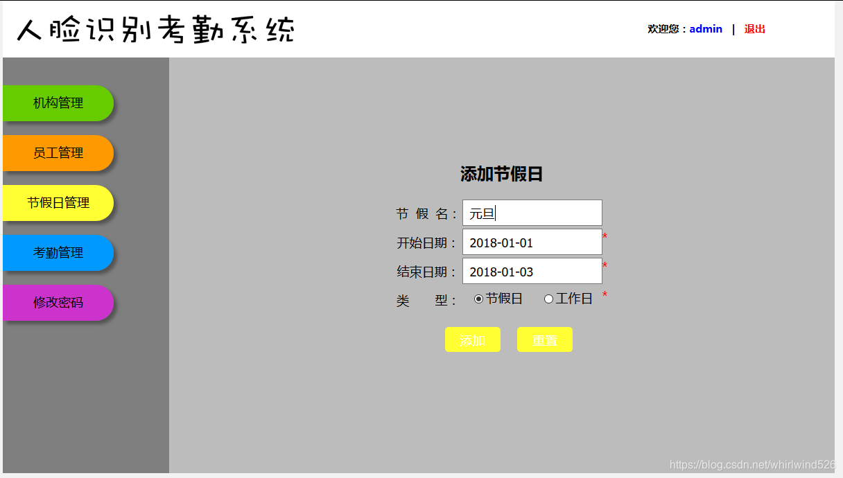 20. 点击【添加节假日】按钮,进入添加节假日页面。根据文本框提示输入信息,点击【添加】按钮。如下图: