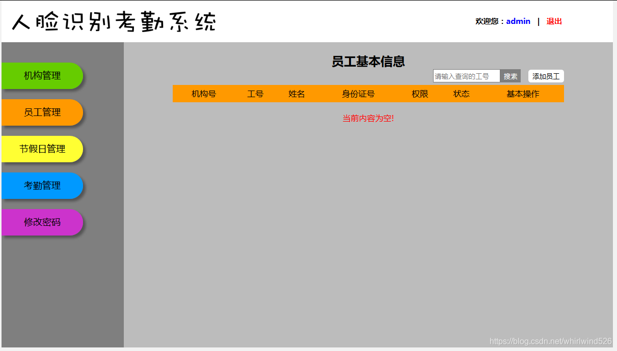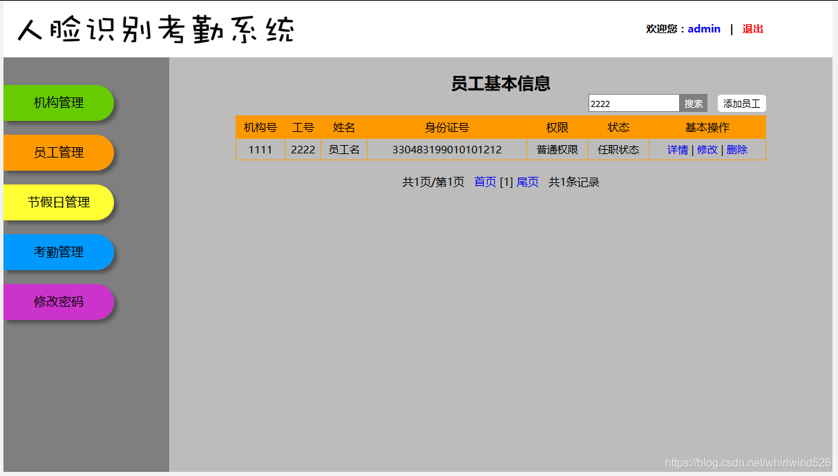 13. 查询成功后,进入员工信息页面。该页面可添加员工、搜索员工、修改员工和删除员工。如下图: