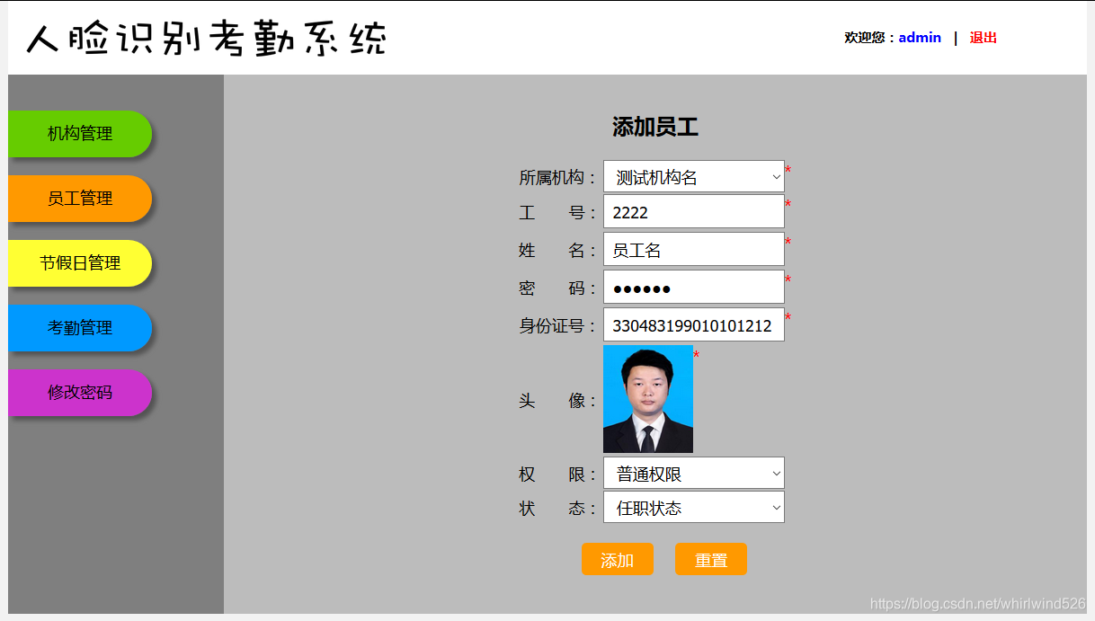 14. 点击【添加员工】按钮,进入添加员工页面。根据文本框的提示输入信息,点击【添加】按钮。如下图: